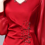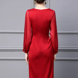 La coupe ajustée épouse délicatement votre silhouette tandis que le décolleté en V et les manches longues bouffantes ajoutent une touche de sophistication indéniable. Conçue en polyester satiné, cette magnifique pièce mi-mollet promet aussi bien confort que style irréprochable pour vos soirées d'hiver.