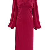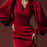 La coupe ajustée épouse délicatement votre silhouette tandis que le décolleté en V et les manches longues bouffantes ajoutent une touche de sophistication indéniable. Conçue en polyester satiné, cette magnifique pièce mi-mollet promet aussi bien confort que style irréprochable pour vos soirées d'hiver.