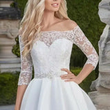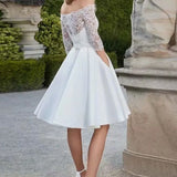 Éblouissante robe de mariée courte en dentelle, manches 3/4 et jupe évasée